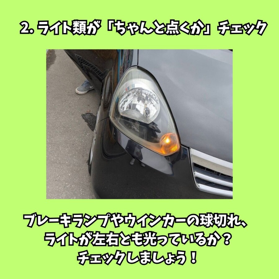 - ライト類が「ちゃんと点くか」チェック