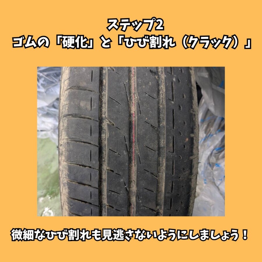 製造から年数が経過すると、紫外線や熱によりゴムが硬化し、サイドウォールや溝の底に亀裂(クラック)が生じます。これが進行すると走行中のバースト(破裂)に繋がるため、微細なひび割れも見逃さないようにしましょう。