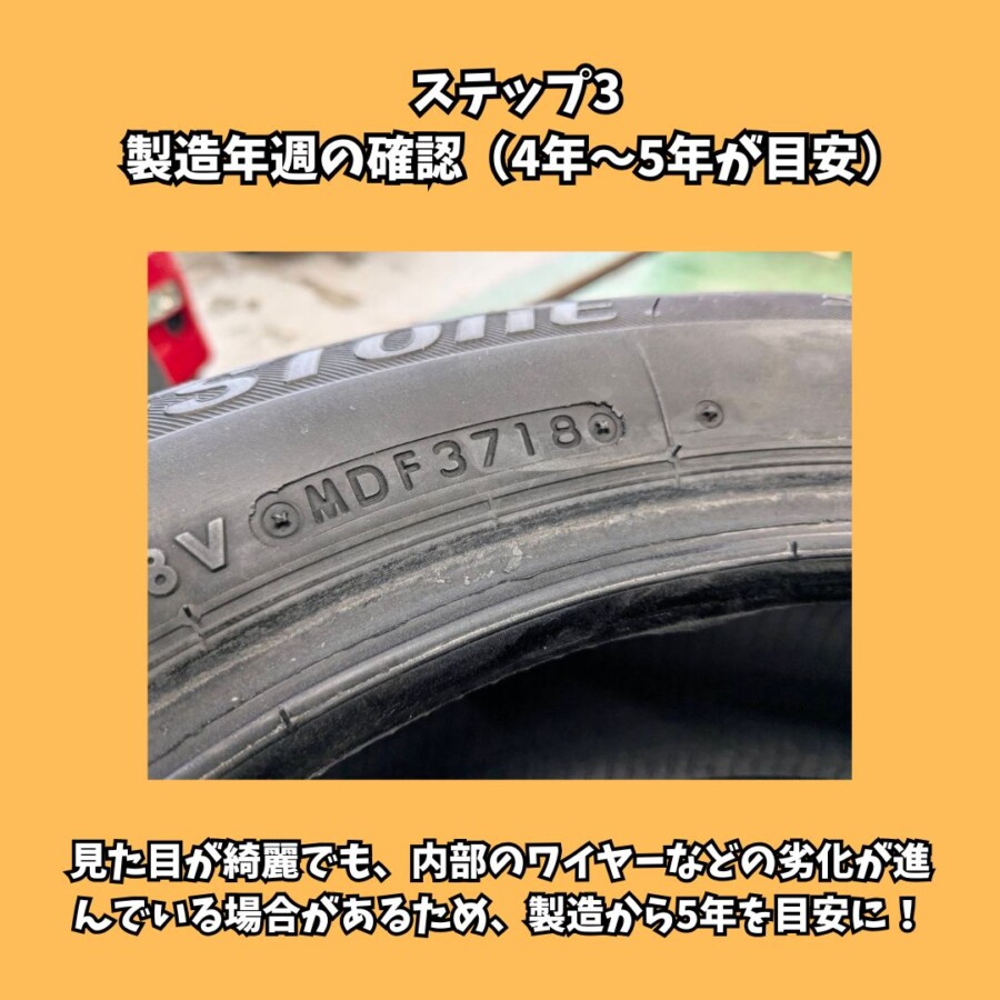 一般的にタイヤの寿命は4〜5年と言われています。たとえ見た目が綺麗でも、内部のワイヤーなどの劣化が進んでいる場合があるため、製造から5年以上経過しているものはプロによる診断を推奨します。
